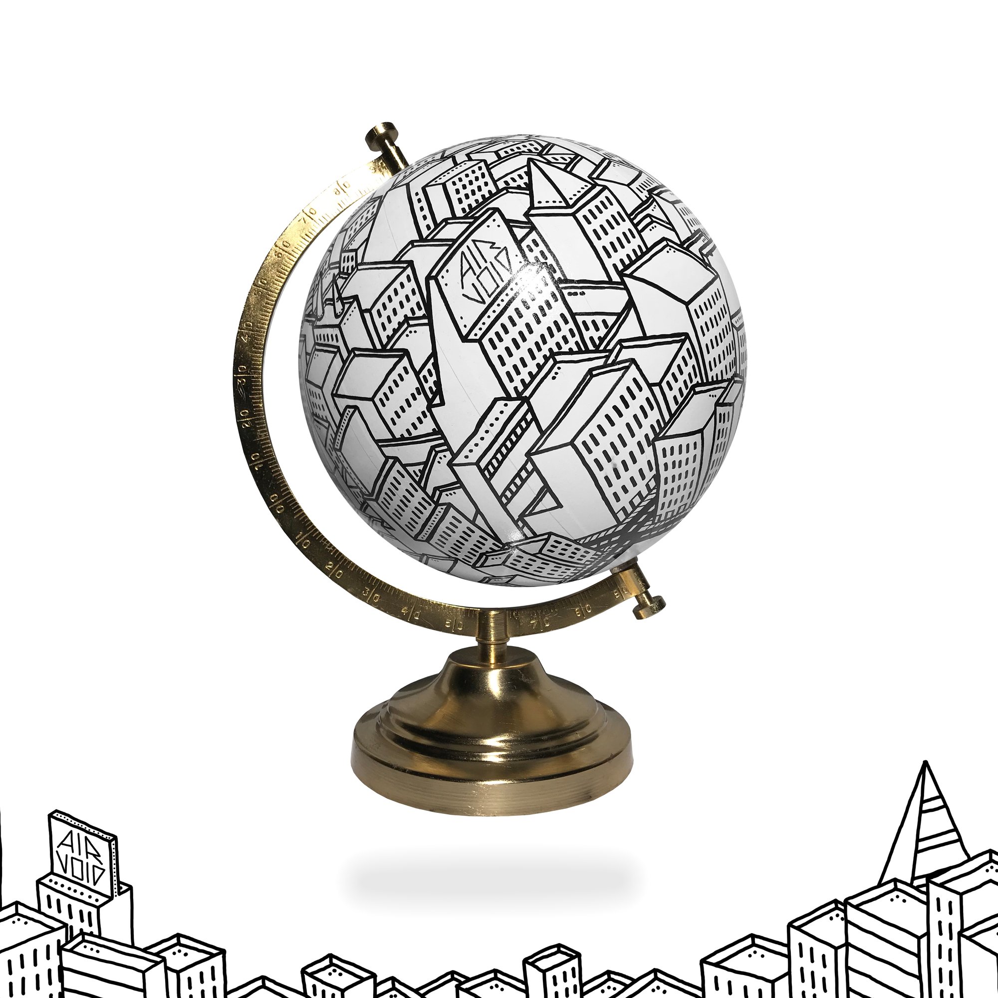 Continuous city-scape painted around the entire globe, the city meshes seamlessly.